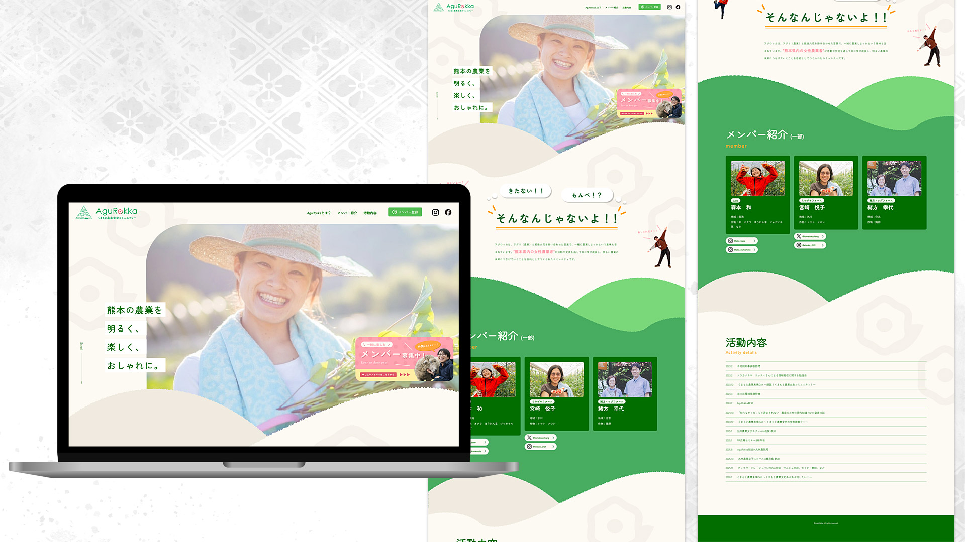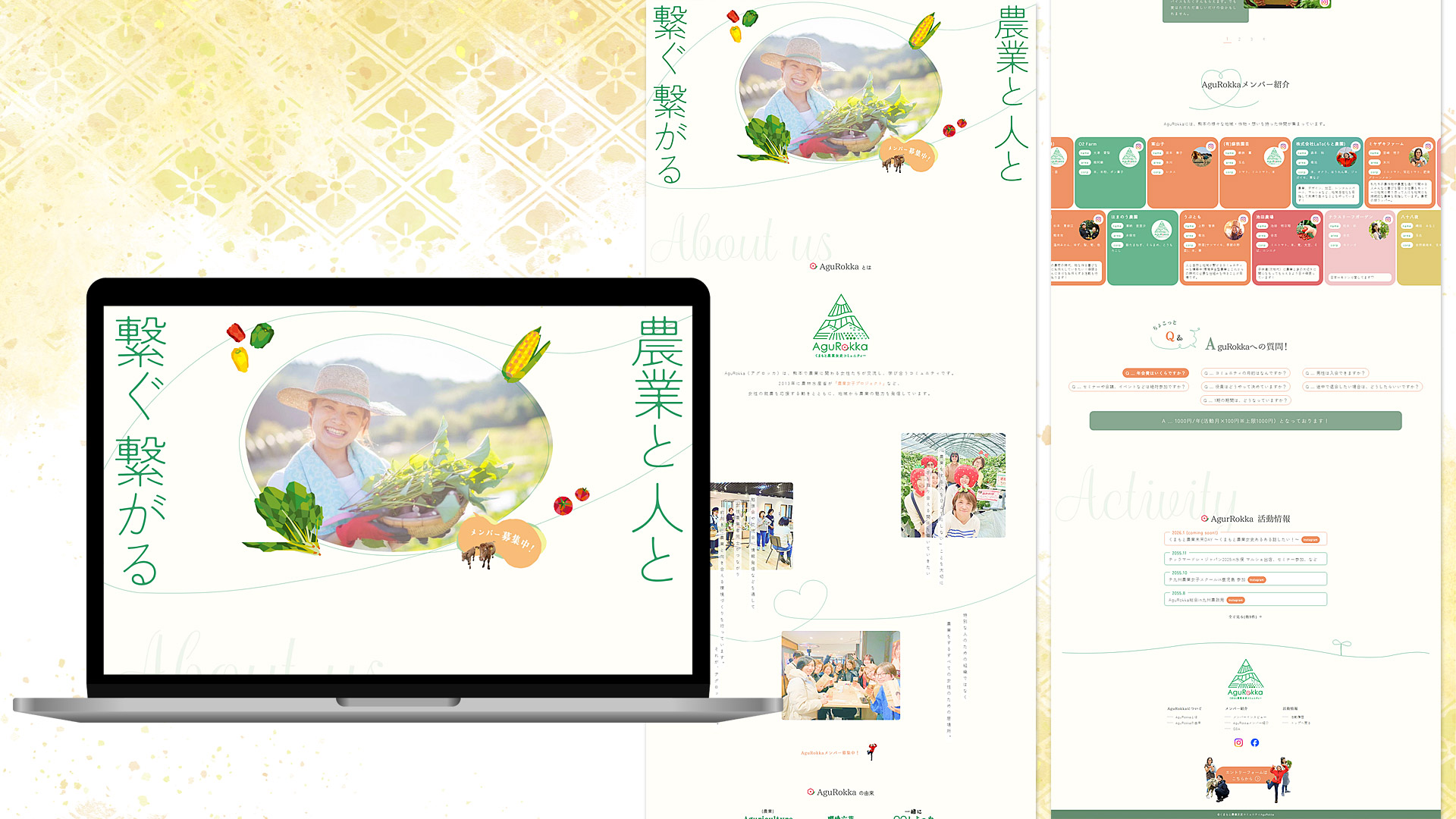 こだわりはサイトの入り口であるファーストビューです。文字・野菜・線が順に現れ輪を繋ぐように展開する構成で、表示をずらすことで情緒を感じられる演出を意識しました。コンセプトの「繋がり」、表現したい優しさ・明るさ・楽しさを集約することで、AguRokka様の魅力が第一印象でしっかりと伝わるサイトを目指しました。