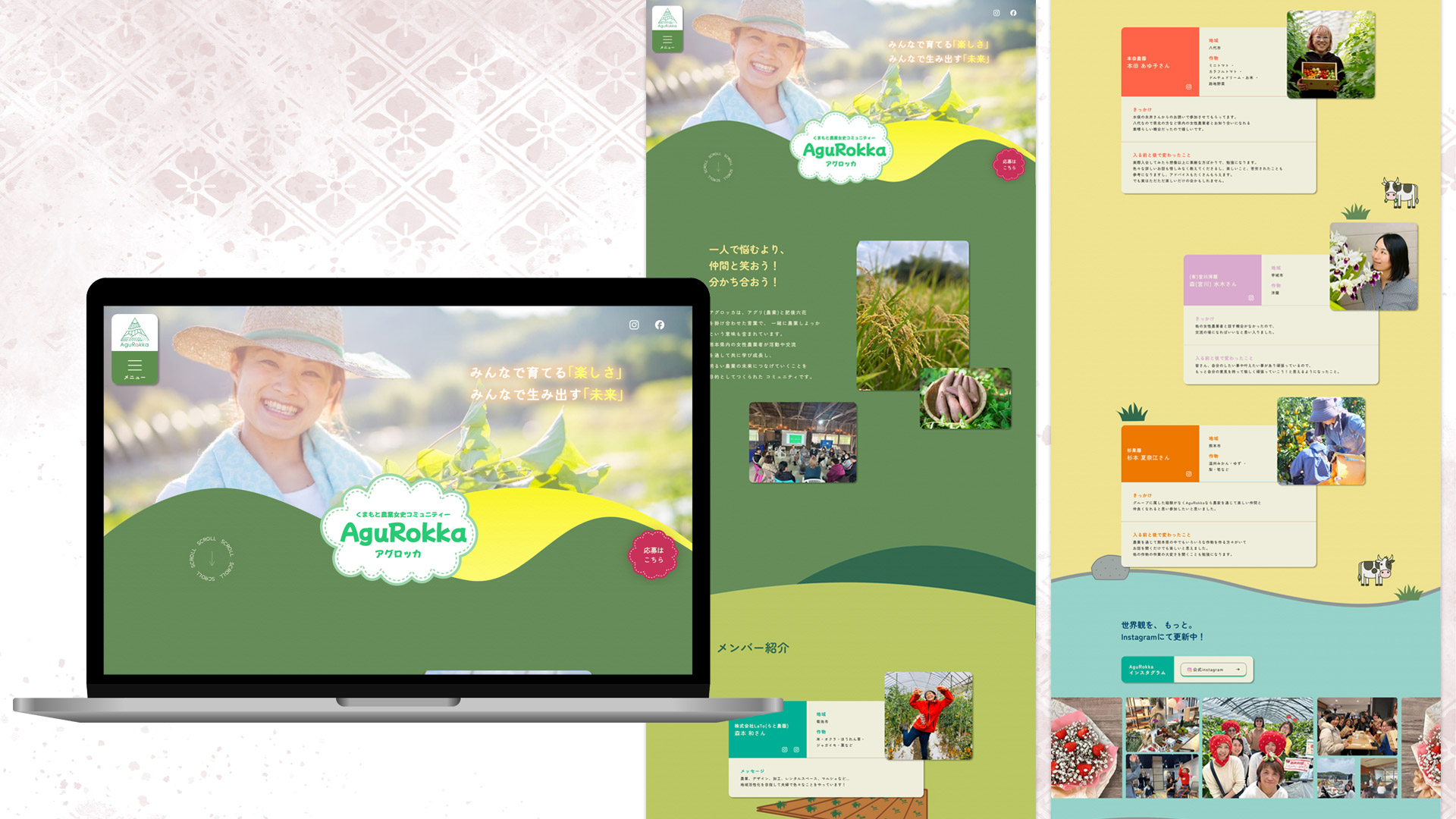 AguRokka様のロゴにもある「自然」をモチーフにしたデザインにしました。色を多く使用していますが、背景の緑に対して目立たせたい順に、①応募フォームは赤系、②Instagramは青系というように、重要度に応じて色の配分や構成を工夫しています。また、コンテンツの配置についても、ユーザーの動線を意識して読みやすさ重視で設計しました。さらに、私の得意なコーディングを活かし、どのデバイスで見てもレイアウトが崩れないようレスポンシブ対応を行いました。